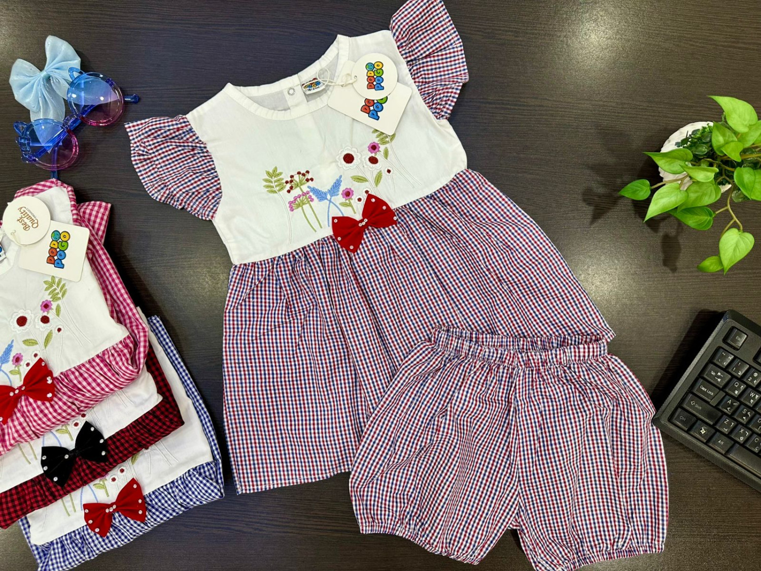 ? Design: Checkered pattern with floral embroidery and a cute bow detail