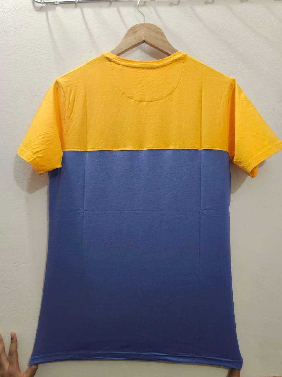 Add a fresh touch to your casual collection with this NEW STYLE printed half-sleeve t-shirt. Featuring a bold color block design in mustard yellow and royal blue, this tee is crafted from 100% pure cotton for breathable comfort and all-day wear.