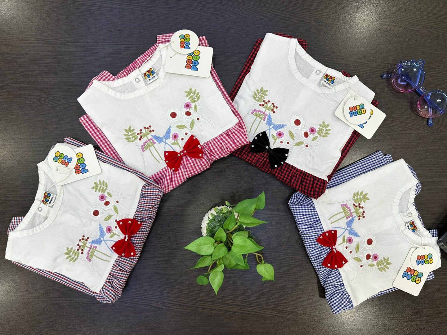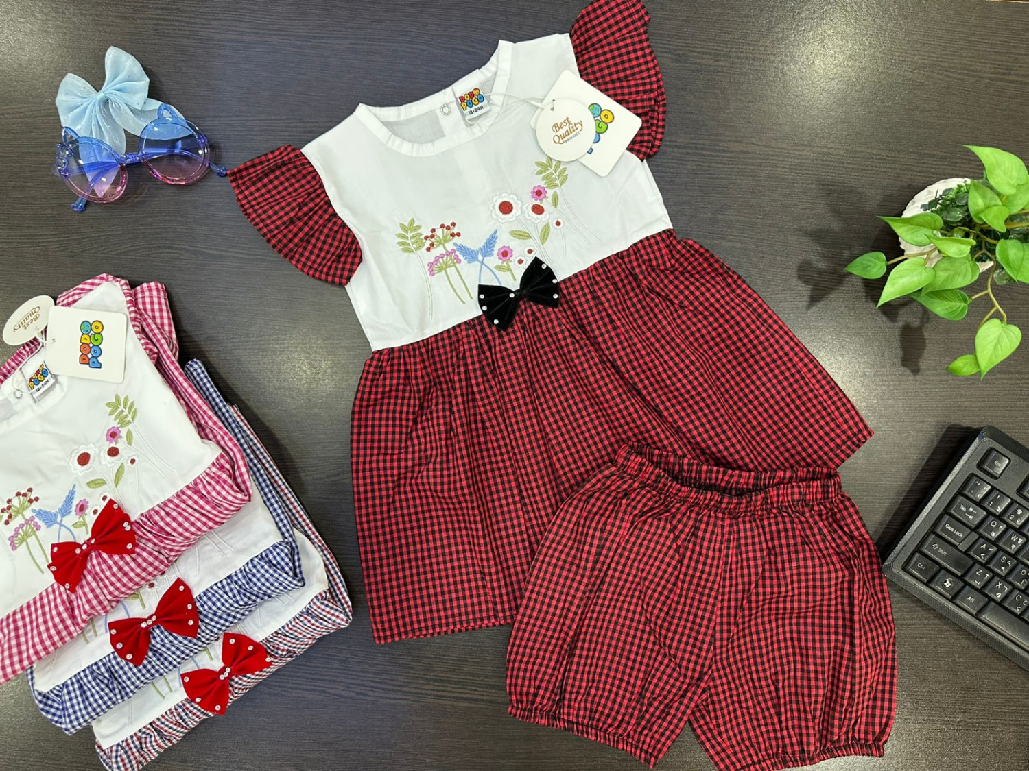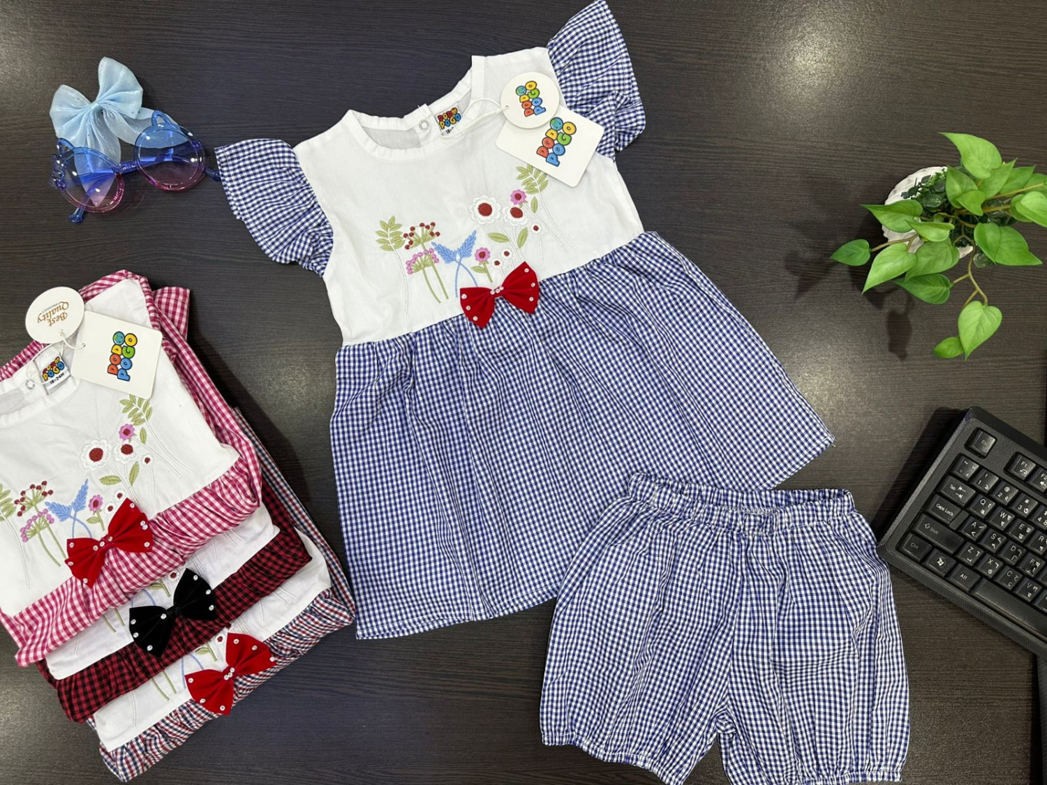 ? Design: Checkered pattern with floral embroidery and a cute bow detail