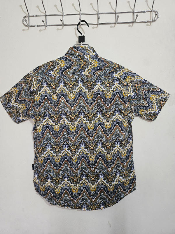 Elevate your casual style with this premium men’s short sleeve shirt featuring a bold zigzag wave print in rich tones of yellow, white, black, grey, and brown. Crafted for comfort and style, this lightweight shirt is perfect for summer outings, beach trips, and casual gatherings.