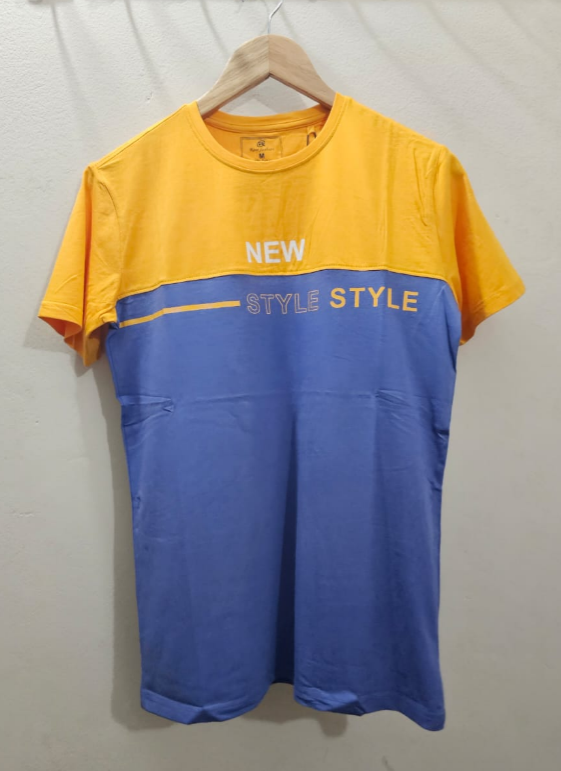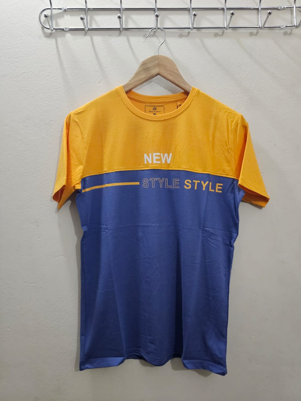 Add a fresh touch to your casual collection with this NEW STYLE printed half-sleeve t-shirt. Featuring a bold color block design in mustard yellow and royal blue, this tee is crafted from 100% pure cotton for breathable comfort and all-day wear.